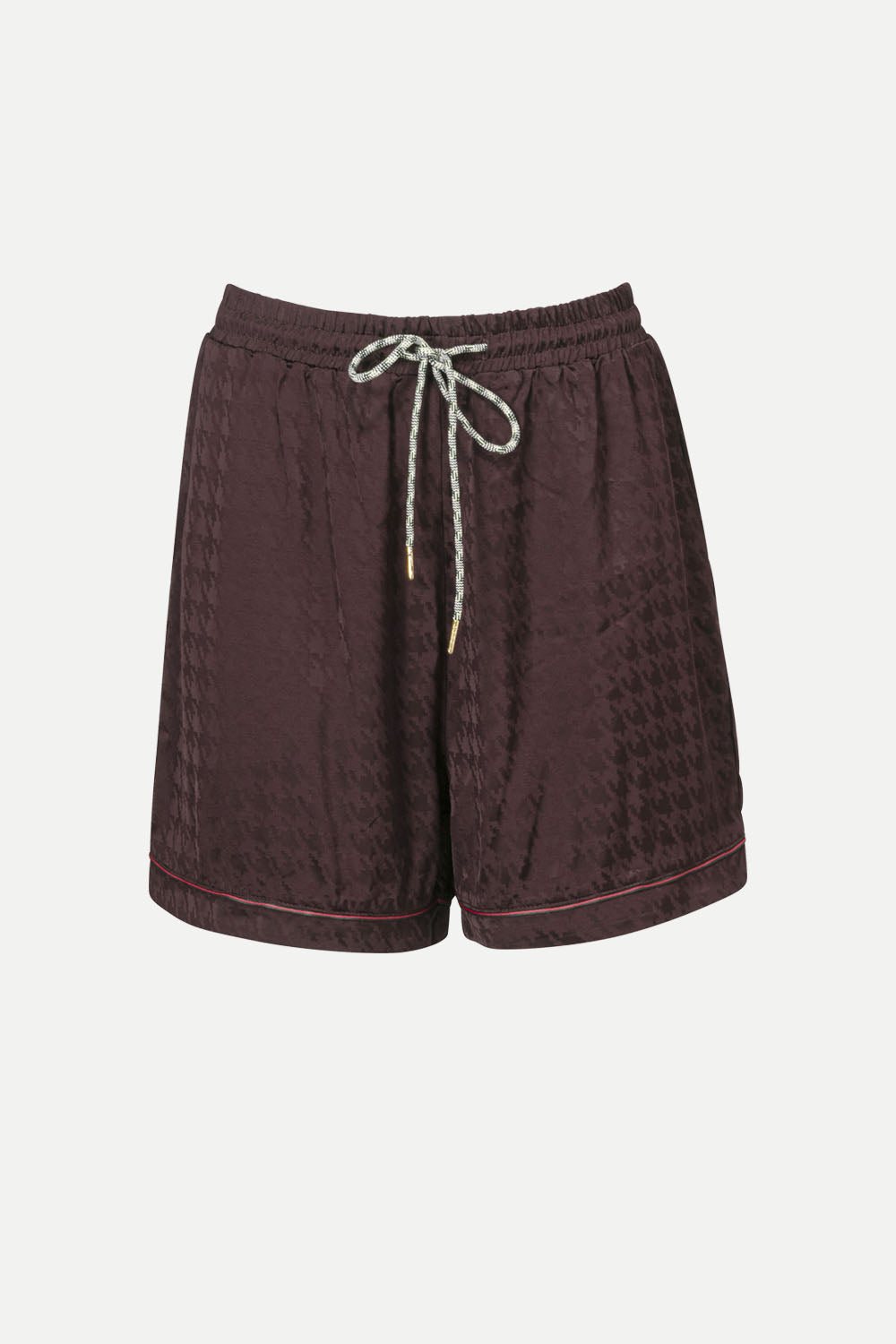 Relaxed-fit shorts in a rich burgundy tone with a subtle peppita jacquard texture. Designed with an elastic waistband and adjustable drawstring in contrasting color with metallic tips. Finished with delicate contrast piping along the hem for an elevated, sporty-chic look.