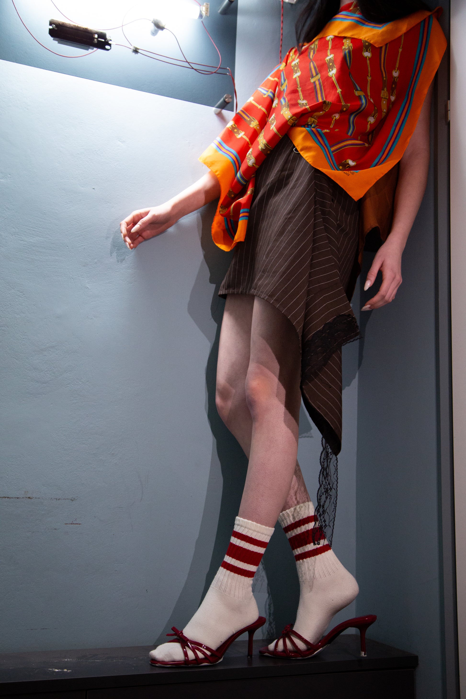 A modern twist on classic tailoring — this brown pinstripe mini skirt features a clean silhouette with a draped asymmetric panel that falls elegantly to one side. The delicate lace trim adds a subtle touch of femininity, perfectly balancing the structured suiting fabric.